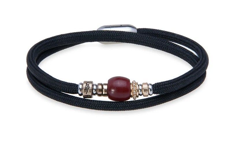 Pulsera unisex Olyn BB053N con doble cuerda de nylon negro y detalles en resina granate y acero inoxidable. Diseño elegante y versátil, ideal para hombres y mujeres que buscan un accesorio moderno y sofisticado. Perfecta para combinar con cualquier estilo, desde casual hasta semi-formal.