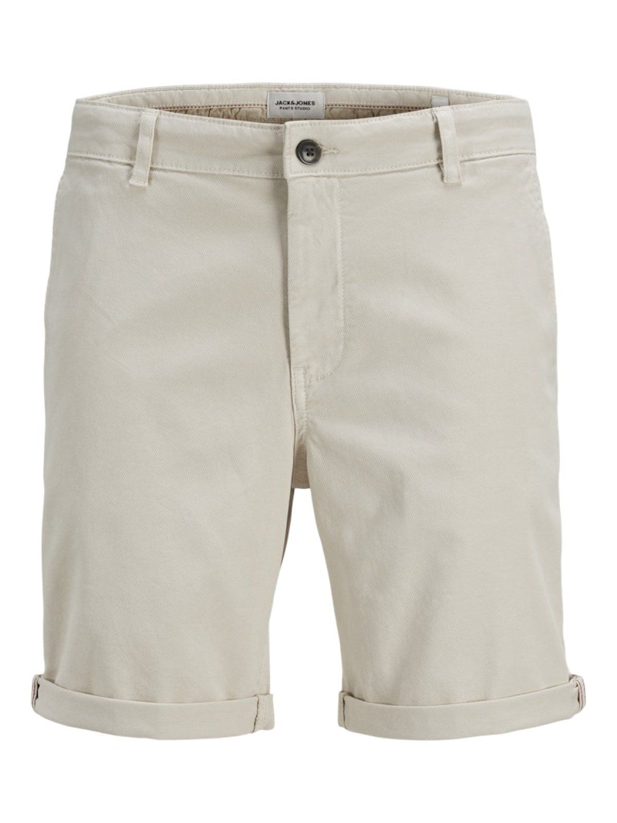 Bermuda Jack & Jones Moonbean en color beige, confeccionada en algodón de alta calidad. Diseño casual con puños enrollados, bolsillos frontales y cierre con botón y cremallera. Ideal para looks veraniegos y diarios, combina estilo y comodidad para hombres adultos. Perfecta para ocasiones informales y días de calor.