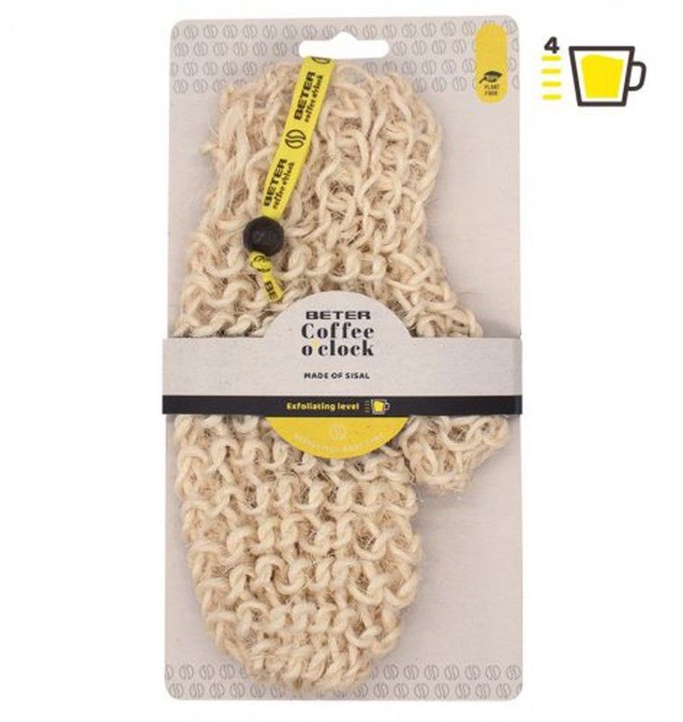 Manopla de masaje Beter con dedo separado, fabricada en sisal natural para una exfoliación profunda y efectiva. Ideal para uso en el baño o ducha, ayuda a eliminar células muertas y estimular la circulación. Su textura robusta y diseño ergonómico facilitan el masaje corporal. Perfecta para adultos que buscan una rutina de cuidado de piel natural y