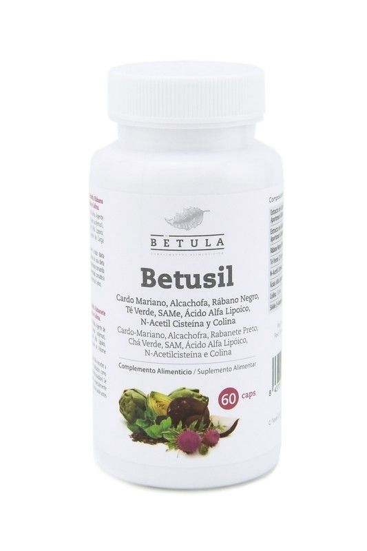 Betusil 60 cápsulas, suplemento alimenticio de Betula con ingredientes naturales como cardo mariano, alcachofa, rábano negro, té verde, SAMe y ácido alfa lipoico. Ideal para apoyar la salud hepática y el metabolismo. En bote de plástico blanco con etiqueta clara y diseño natural. Para adultos que buscan un complemento nutricional de calidad.