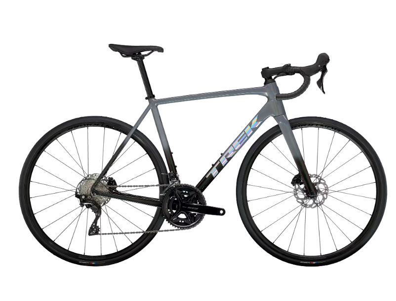 Bicicleta carretera Trek Emonda ALR5, ideal para ciclistas adultos que buscan rendimiento y ligereza. Cuadro de aluminio con detalles en carbono, frenos de disco hidráulicos y transmisión Shimano. Diseño aerodinámico, acabado gris mate con logotipo iridiscente. Perfecta para entrenamientos y competiciones en carretera.