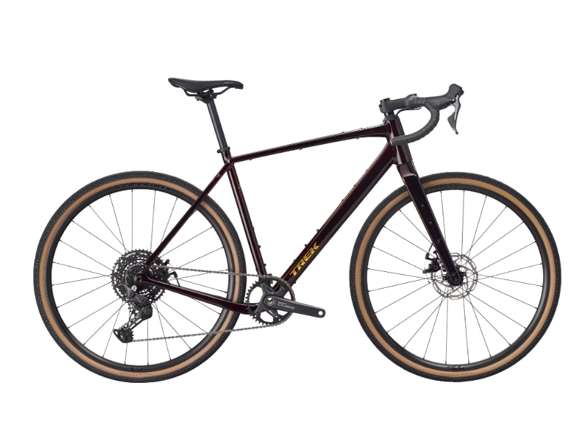 Cuadro de aluminio con acabado marrón oscuro brillanteManillar tipo drop con gomas negrasRuedas con llantas negras y neumáticos de color marrón claroFrenos de disco hidráulicosTransmisión shimano con múltiples velocidadesLogotipo 'trek' en dorado en el tubo inferior del cuadroSillin negro ergonómicoCadena metálica y piñones traseros visibles