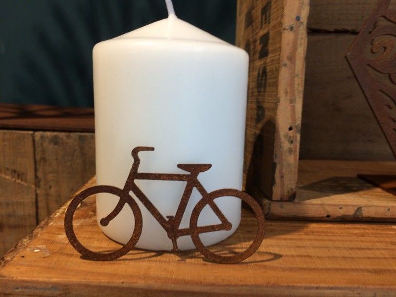 Adorno decorativo en forma de bicicleta fabricado en metal con acabado rústico, perfecto para acompañar velas o como pieza única en mesas, estanterías o rincones decorativos. Ideal para amantes de la bicicleta o como regalo original para fiestas y celebraciones. Combina estilo vintage con funcionalidad decorativa.