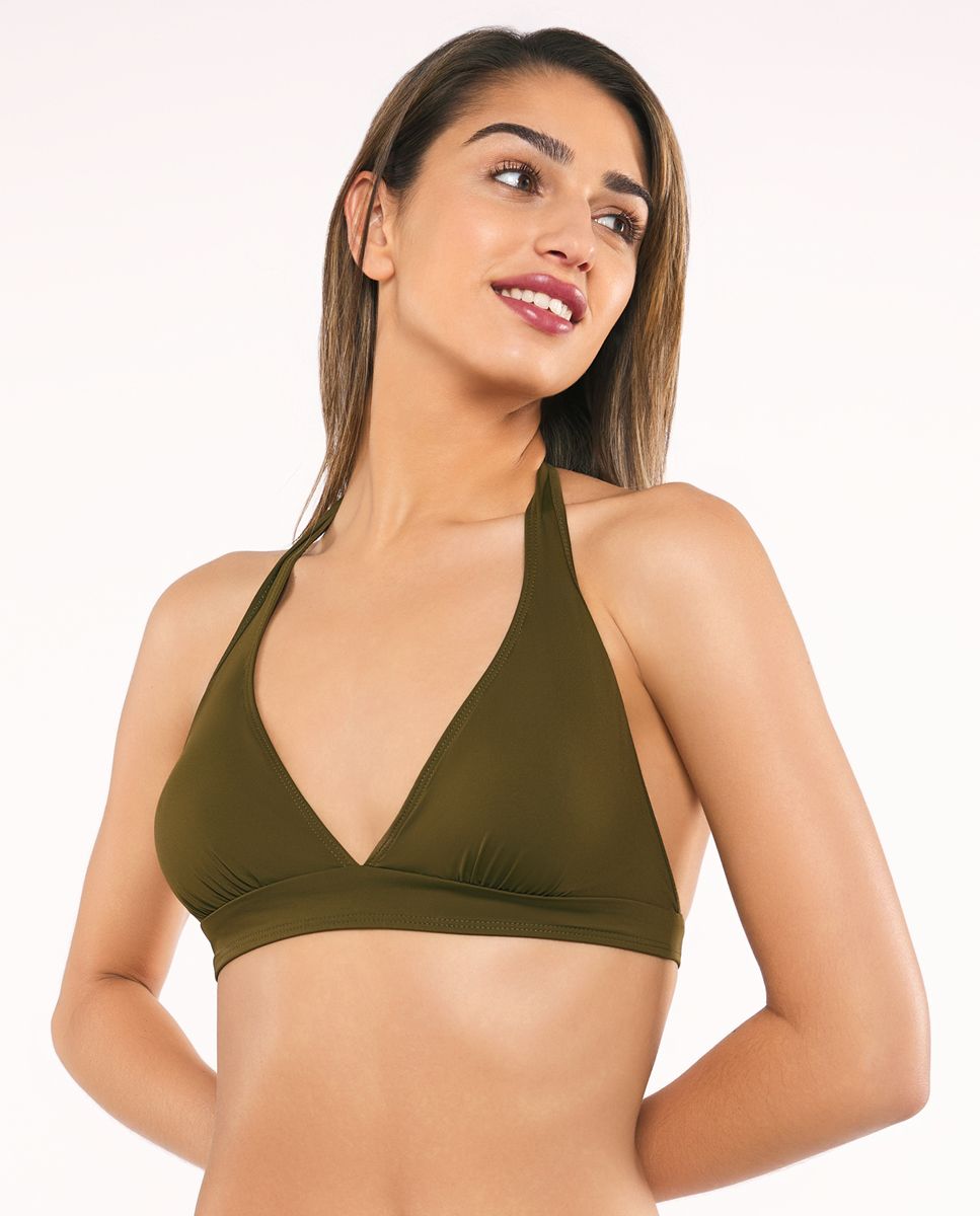 Top de bikini Red Point en color verde oliva, con diseño halter y escote en V profundo. Confeccionado en tejido elástico de poliéster y elastano, ofrece comodidad y ajuste perfecto. Ideal para mujeres que buscan estilo y funcionalidad en trajes de baño. Perfecto para días en la playa o piscina.