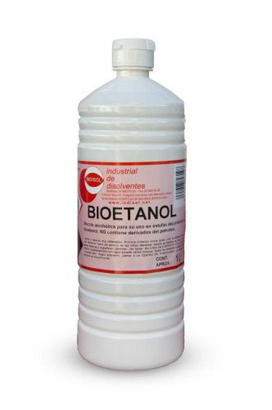 Botella de 1 litro de bioetanol para chimeneas, ideal para uso en estufas decorativas. Producto industrial de disolventes, sin derivados del petróleo. Envase de plástico transparente con etiqueta clara y profesional. Perfecto para crear ambientes cálidos y acogedores sin humo ni olores molestos.