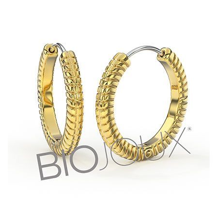 Pendientes Biojoux BJT387 Queen Anne de 22mm, con diseño elegante y texturizado en forma de trenza, acabado dorado brillante. Fabricados en metal hipoalergénico, ideales para uso diario o ocasiones especiales. Su cierre de presión asegura comodidad y seguridad. Joyería de calidad para adultos que buscan estilo y durabilidad.