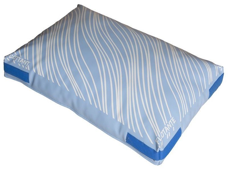 Cojín flotante de diseño moderno con patrón geométrico en tonos azul claro y blanco. Fabricado en poliéster de alta calidad, ideal para relajarse en la piscina o el mar. Su forma rectangular y bordes azules intensos lo hacen elegante y funcional. Perfecto para adultos que buscan comodidad y estilo en el agua.
