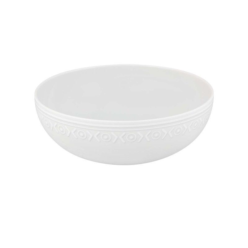 Bol decorativo de porcelana blanca, ideal para cereales, ensaladas o como pieza de decoración en tu mesa. Con un elegante diseño geométrico grabado en el borde, aporta un toque sofisticado a tu hogar. Resistente y fácil de limpiar, perfecto para uso diario o ocasiones especiales. Diámetro 14 cm, altura 5,3 cm.