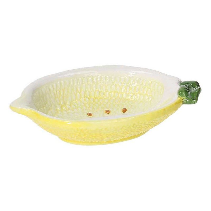 Bol decorativo en gres con diseño de limón, ideal para decorar tu cocina o mesa. Con acabado texturizado que imita la cáscara del fruto, asa en forma de hoja verde y detalles blancos. Perfecto para servir frutas, dulces o como pieza decorativa. Medidas: 15 x 10 x 4 cm. Calidad duradera y estilo fresco para tu hogar.
