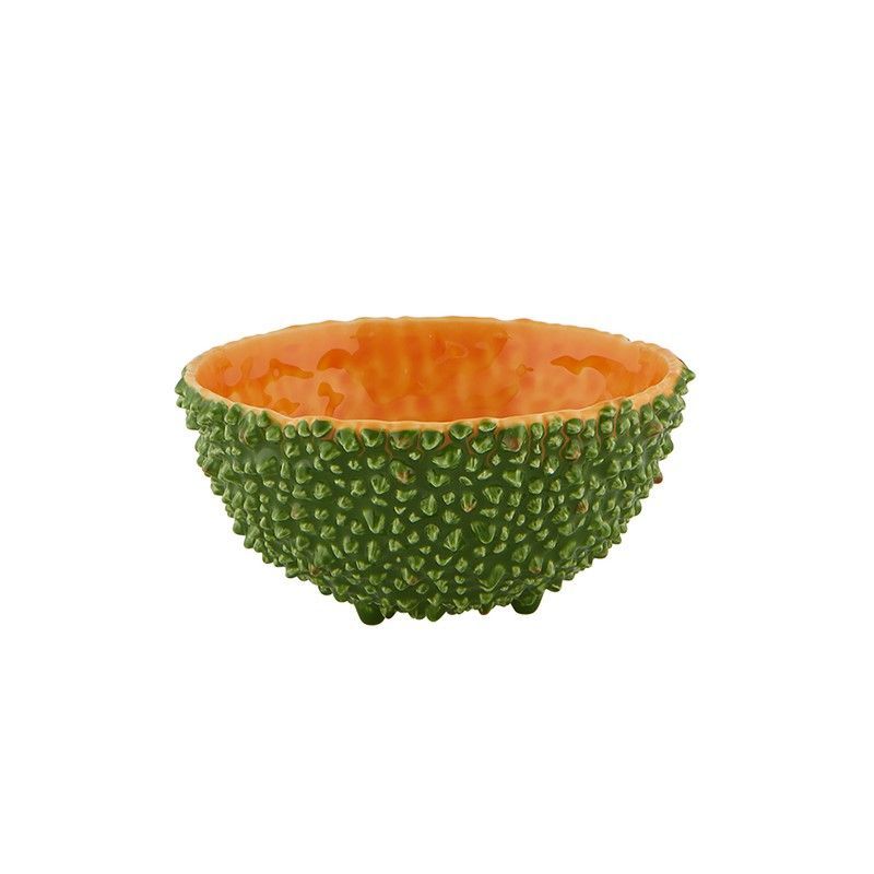 Bol decorativo de loza en verde y naranja, ideal para decorar tu hogar con un toque tropical. Con textura exterior que imita la cáscara de fruta y interior brillante, es perfecto para servir frutas, dulces o como pieza decorativa. Diseño exclusivo Amazónia, calidad duradera y estilo natural.
