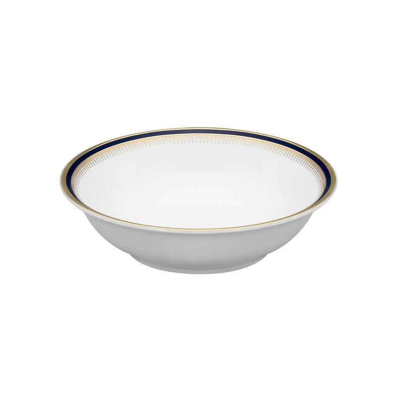 Bol de porcelana de alta calidad en blanco, con elegantes detalles en azul y dorado. Ideal para servir salsas, ensaladas o postres con estilo. Diseño clásico y sofisticado, perfecto para cualquier mesa. Medidas: 13,6 x 13,6 x 3,7 cm. Adecuado para uso diario o ocasiones especiales.