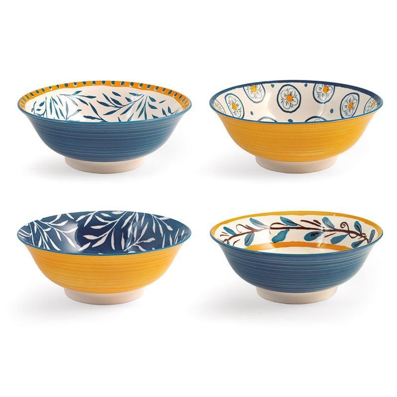 Juego de 4 bols de cerámica Salina/Tropea, ideales para servir ensaladas, cereales o postres. Con diseño decorativo en azul, naranja y blanco, combinan estilo mediterráneo con funcionalidad. Perfectos para uso diario o como regalo. Calidad duradera y acabado texturizado que aporta elegancia a tu mesa.