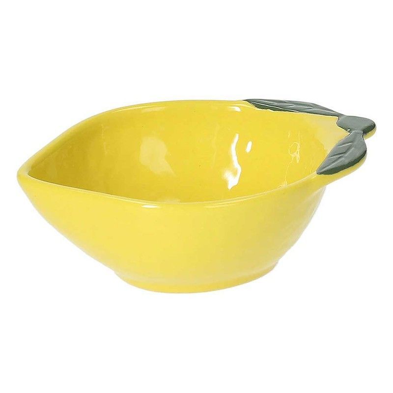 Bol decorativo de gres en forma de limón, con acabado brillante y diseño de hoja verde. Ideal para decorar tu cocina o mesa, también perfecto como cuenco para frutas o snacks. Su color amarillo vibrante y diseño original aportan un toque fresco y divertido a cualquier espacio. Fabricado en gres de calidad, resistente y fácil de limpiar.