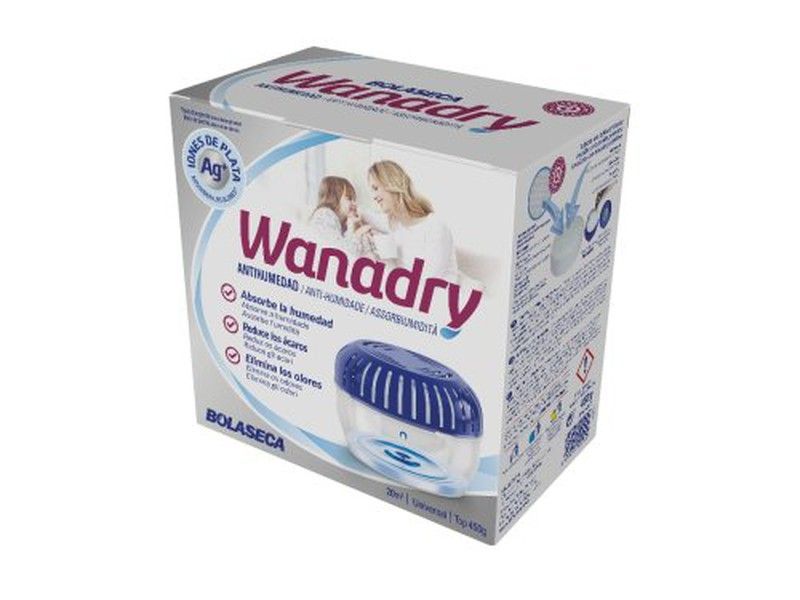 Wanadry Bolaseca Aparato Super: caja de embalaje para un dispositivo deshumidificador y ambientador para el hogar. Ideal para mantener espacios secos, libres de olores y bacterias gracias a sus iones de plata. Perfecto para armarios, baños o habitaciones. Contiene 200g de producto. Diseño limpio y funcional con detalles en azul y blanco.