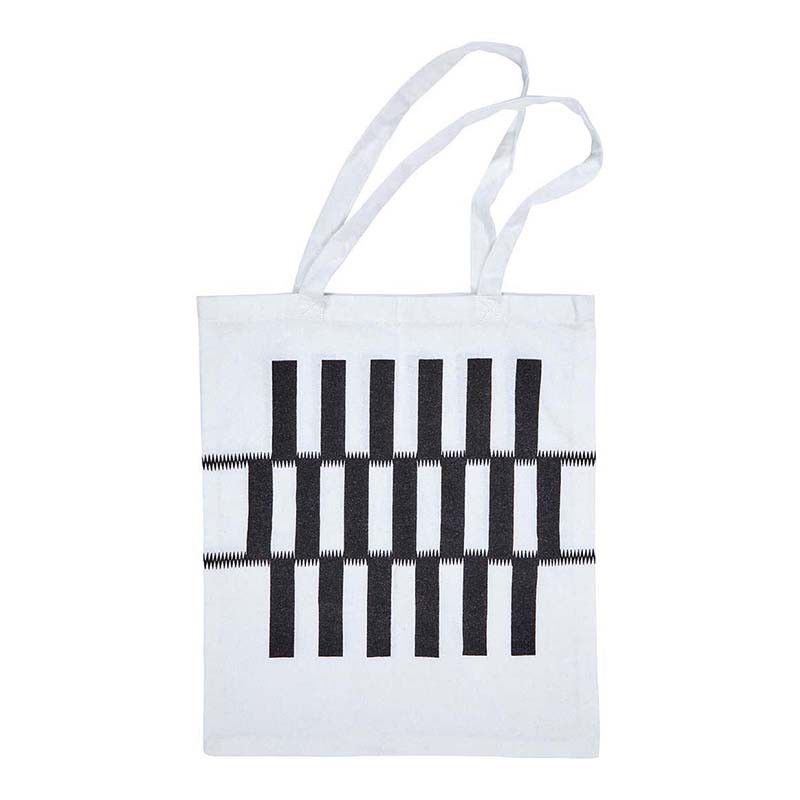 Bolsa de algodón orgánico blanco con diseño geométrico en negro, ideal para uso diario o como complemento decorativo. Con asas largas y acabado elegante, combina funcionalidad y estilo. Perfecta para llevar a la compra, al trabajo o como bolsa de mano sostenible.