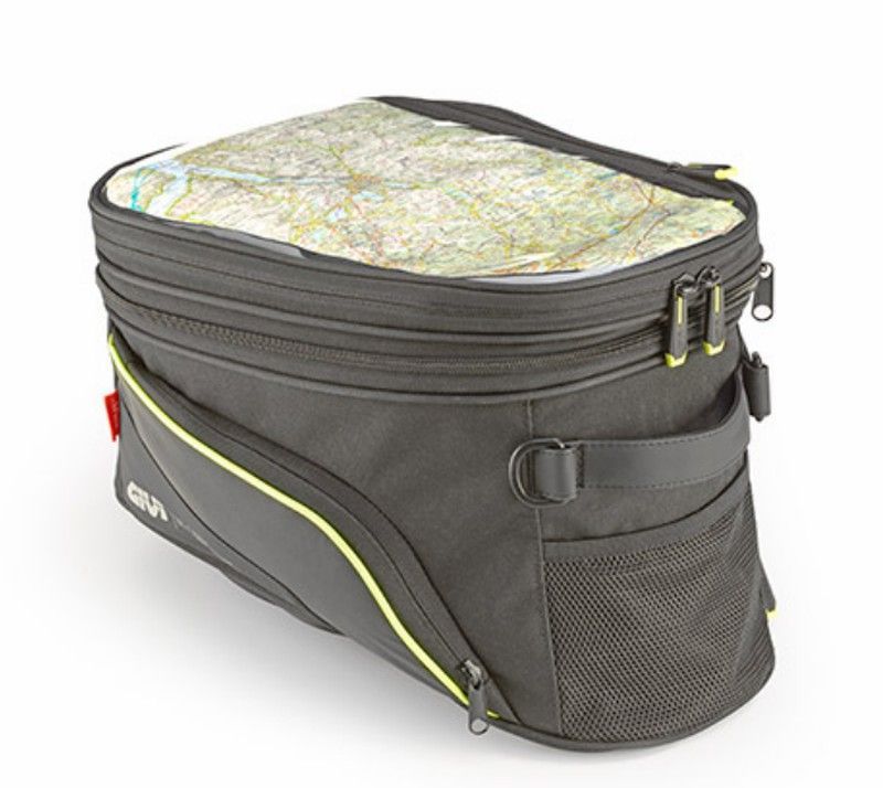 Bolsa de depósito extensible para moto Trail con sistema TANKLOCK, ideal para viajes largos. Fabricada en lona y poliéster resistente, con capacidad de 21 a 27 litros. Incluye compartimento lateral con malla y cierre seguro. Diseño funcional con tapa estampada de mapa y detalles en verde. Perfecta para motociclistas que buscan almacenamiento seguro