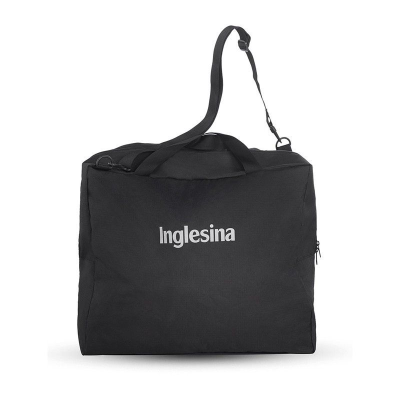 Bolsa de transporte Inglesina Quid 2 en color negro, fabricada en poliéster resistente y ligero. Ideal para transportar sillas de paseo o accesorios para bebé con comodidad. Cuenta con asa larga ajustable y asas cortas para mayor versatilidad. El logotipo 'Inglesina' en blanco aporta un toque elegante y funcional. Perfecta para padres en movimiento