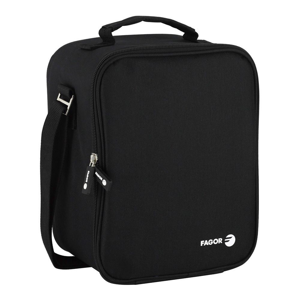 Bolsa porta alimentos Fagor Tappy, ideal para llevar comidas al trabajo o a la escuela. Fabricada en poliéster resistente, con cierre de cremallera y correa ajustable para mayor comodidad. Diseño negro liso y compacto, perfecta para mantener tus alimentos frescos y organizados. Incluye asa superior para transporte fácil. Sin tuppers incluidos.