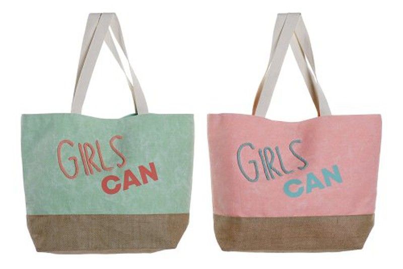 Bolso de algodón y poliéster con diseño colorblock y texto bordado 'GIRLS CAN'. Ideal para mujeres que buscan estilo y mensaje empoderador. Con asas largas y base de lona, perfecto para el día a día, compras o paseos. Disponible en verde y rosa pastel con detalles en marrón. Calidad duradera y diseño moderno.