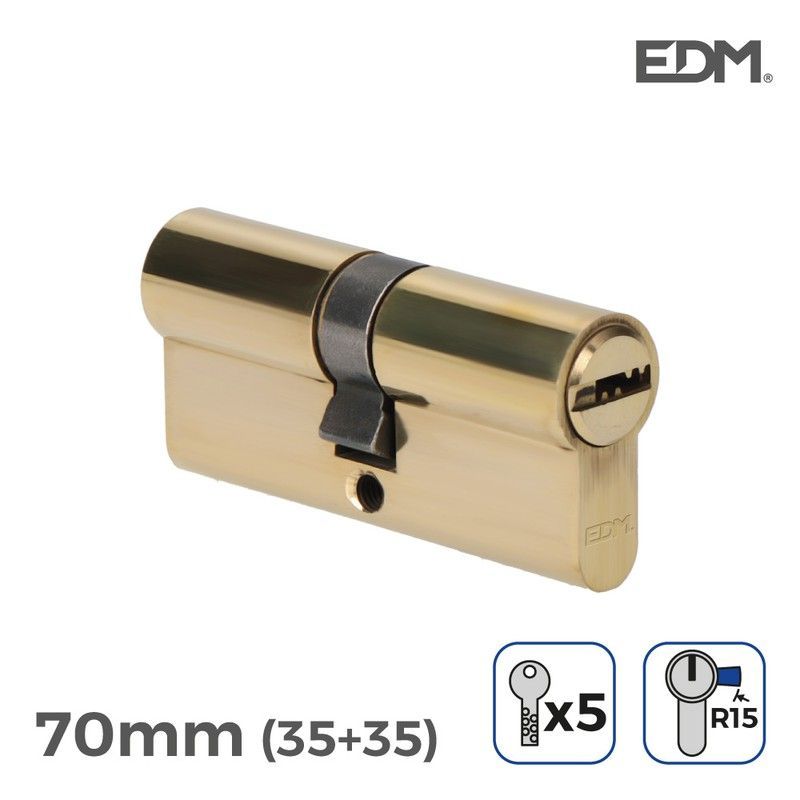 Bombín de latón EDM de 70mm (35+35) con leva larga y perfil de seguridad R15. Incluye 5 llaves de alta seguridad. Fabricado en metal de calidad, ideal para puertas interiores y exteriores que requieren un sistema de cierre confiable y duradero. Perfecto para bricolaje y reformas en hogar y oficina.