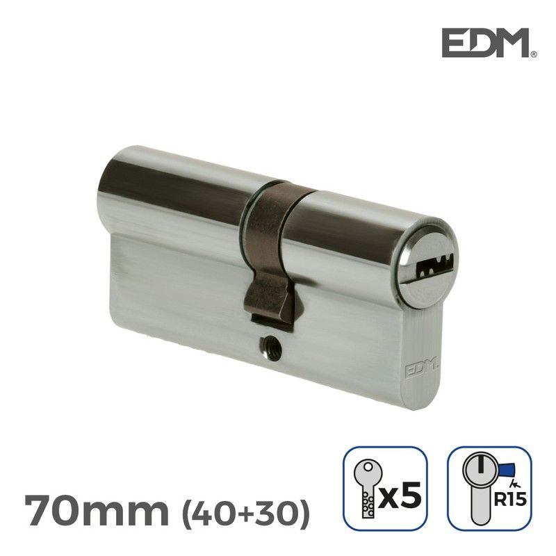 Bombín niquel EDM de 70 mm (40+30 mm) con leva larga y 5 llaves de seguridad tipo R15. Fabricado en acero inoxidable de alta calidad, ideal para puertas de interior y exterior. Diseño robusto y resistente, perfecto para mejorar la seguridad de tu hogar o negocio. Fácil instalación y durabilidad garantizada.