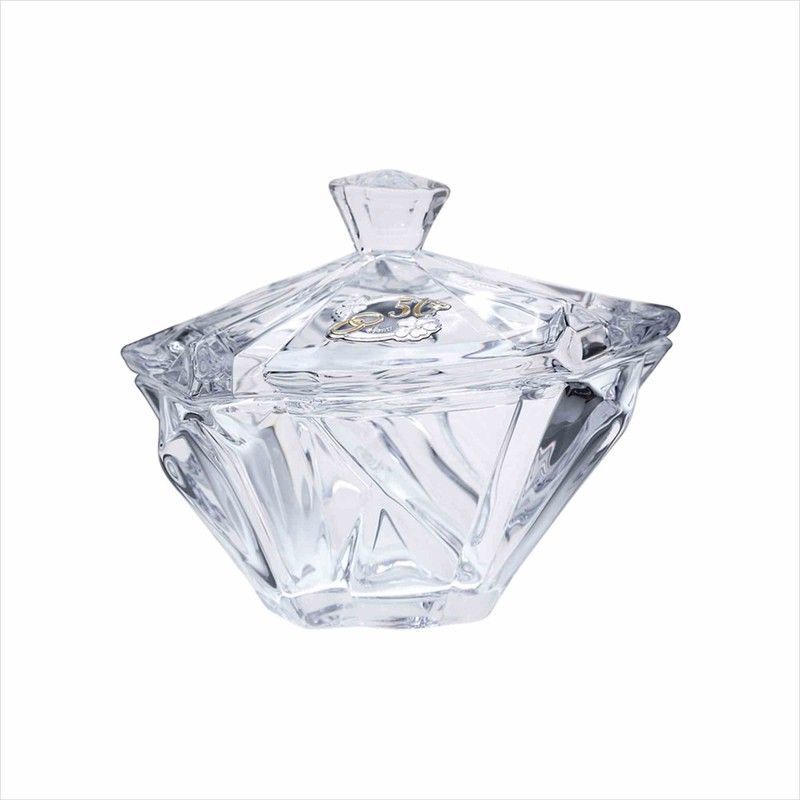 Bombonera conmemorativa de cristal transparente, ideal para celebrar 50 años de matrimonio. Con diseño facetado y tapa con asa en forma de diamante, incluye grabado con anillos entrelazados y texto conmemorativo. Elegante y sofisticada, perfecta como regalo o centro de mesa para bodas de oro.