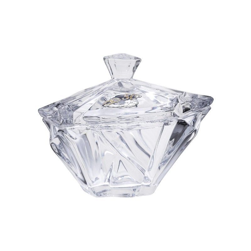 Bombonera conmemorativa de vidrio transparente con acabado facetado, ideal para celebrar 25 años. Diseño elegante con tapa y asa en forma de diamante, detalles plateados y corte geométrico que refleja la luz. Perfecta para regalos especiales o decoración de mesas en eventos importantes.