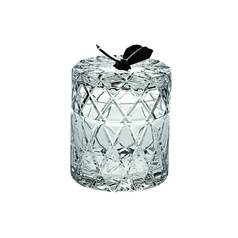 Bombonera de cristal Papillon Noir con corte diamante y tapa con asa en forma de mariposa negra. Diseño elegante y sofisticado, perfecta para almacenar caramelos, chocolates o como pieza decorativa en tu hogar. Ideal para regalos o eventos especiales.
