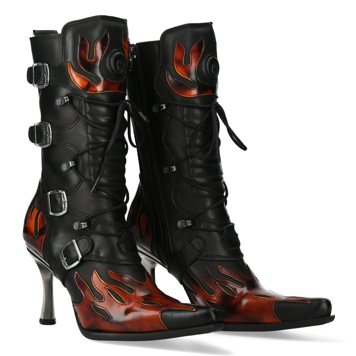 Botas New Rock M-9591-S4 de cuero negro con llamativos detalles de llamas en marrón y naranja. Ideales para amantes del estilo punk, rock y biker. Cierre con cremallera lateral, cordones ajustables y tres hebillas metálicas. Tacones altos y delgados de metal plateado. Calzado de alta calidad para looks audaces y atrevidos.