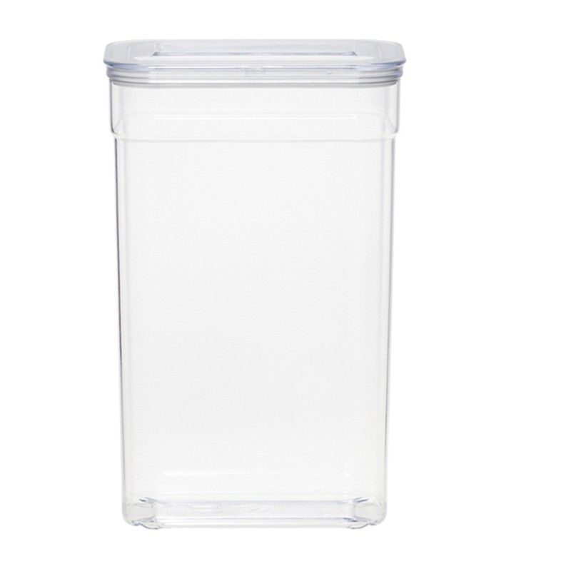 Bote hermético de plástico transparente para cocina, ideal para almacenar alimentos, cereales, azúcar o especias. Diseño rectangular y tapa segura que mantiene los productos frescos. Perfecto para despensa, nevera o cocina organizada. Fácil de limpiar y apilable.