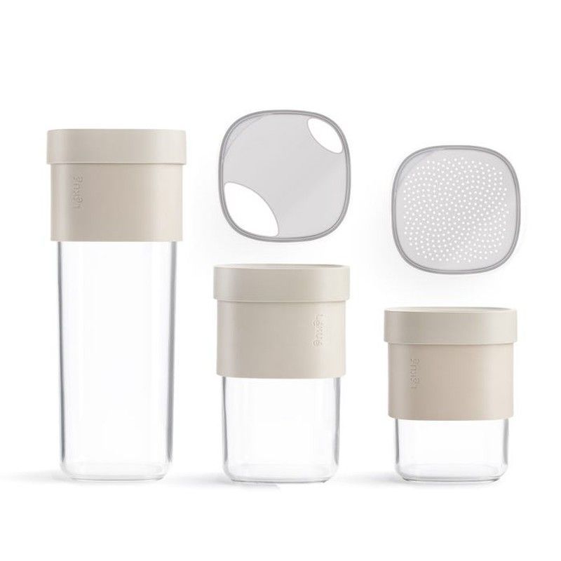 Juego de botes de cocina Lekue Flip Storage Set en color marrón, ideal para almacenar alimentos de forma ordenada y segura. Fabricados con vidrio transparente y tapas de plástico con filtros, permiten ver el contenido y colar líquidos fácilmente. Perfectos para despensa, cocina o nevera. Diseño elegante y funcional para una organización óptima.