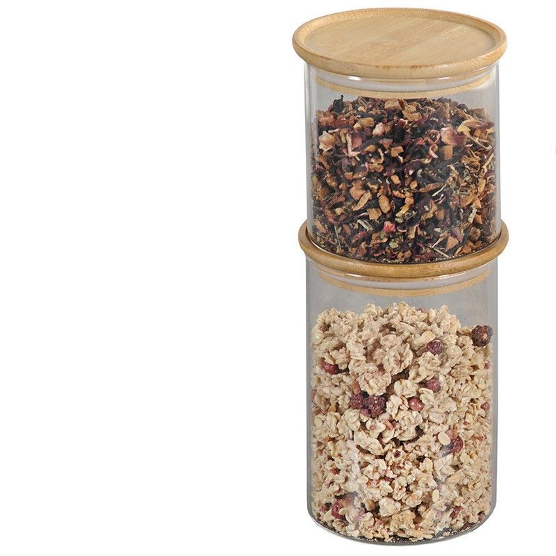Bote de cocina apilable de vidrio con tapa de bambú, ideal para almacenar granola, té seco o cereales. Diseño transparente que permite ver el contenido, fácil de apilar y mantener la frescura. Perfecto para cocinas modernas y organizadas.
