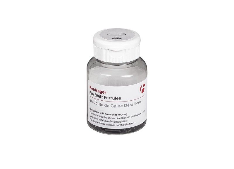 Bote con 50 terminales para funda de cambio Bontrager Pro Shift Ferrules, ideales para bicicletas de carretera y montaña. Fabricadas para encajar en tubos de 4 mm, garantizan una conexión segura y precisa en el sistema de cambios. Incluye terminales negras de alta calidad para un acabado profesional. Perfectas para mecánicos y ciclistas que buscan