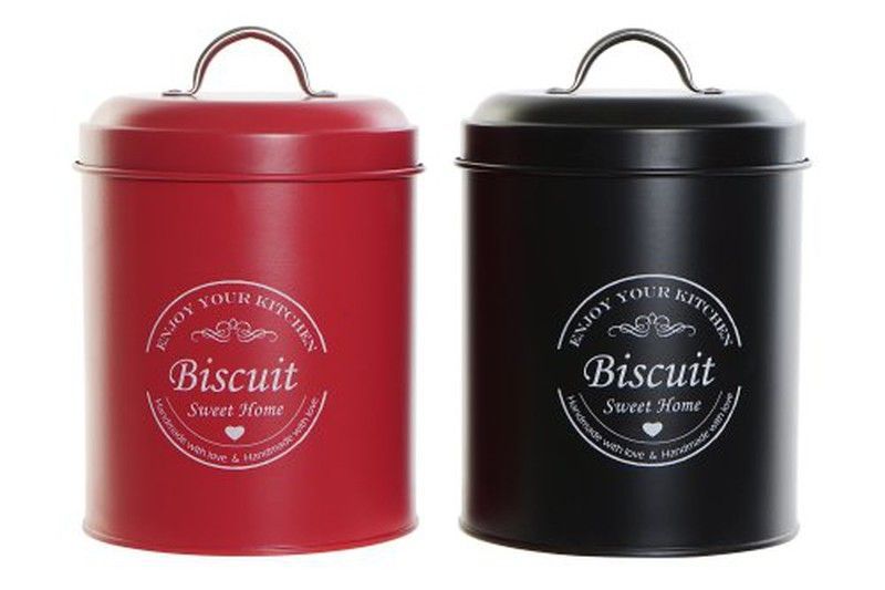Botes metálicos decorativos en rojo y negro, ideales para almacenar galletas, té, café o snacks en la cocina. Con tapa hermética y asa superior, ofrecen un toque elegante y funcional. Perfectos para mantener los alimentos frescos y organizar tu hogar con estilo. Diseño con texto 'Biscuit Sweet Home' y acabado mate.