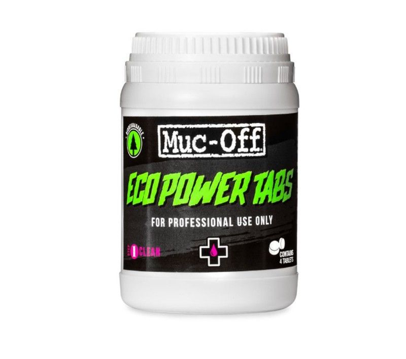Bote de pastillas limpiadoras Muc-Off Eco Power Tabs, ideales para el mantenimiento profesional de bicicletas. Fórmula ecológica y eficaz para eliminar suciedad y grasa. Contenido en bote de plástico blanco con etiqueta negra y detalles en verde. Uso recomendado para profesionales del ciclismo y mantenimiento de equipos deportivos.