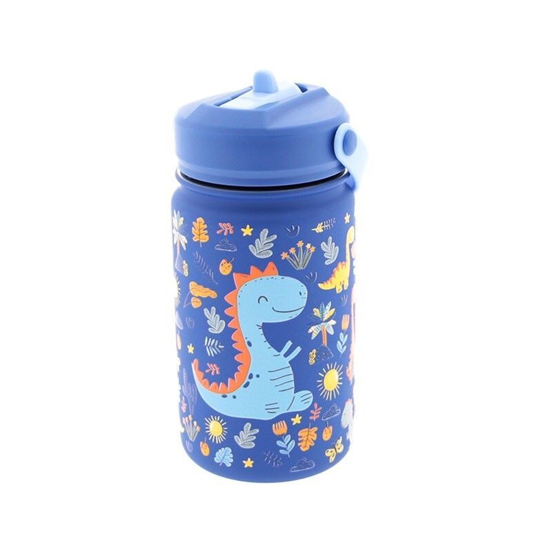 Botella de agua para niños con diseño divertido de dinosaurios en tonos azules y naranjas. Fabricada en plástico seguro, incluye adaptador para beber fácilmente. Ideal para el colegio, excursiones o actividades diarias. Fácil de llevar y resistente al derrame.