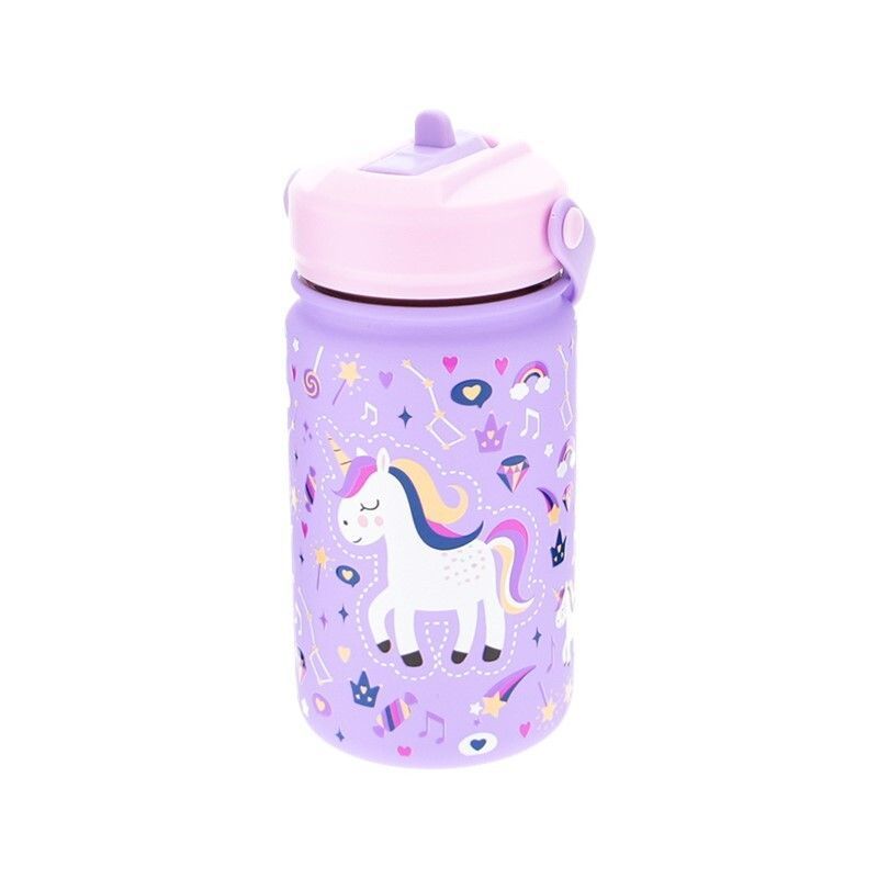 Botella de agua de 330 ml con diseño de unicornio lila y rosa, ideal para niños. Fabricada en plástico seguro con tapón antifuga y adaptador para beber fácilmente. Perfecta para el colegio, excursiones o actividades diarias. Diseño divertido con estrellas, corazones y detalles mágicos que encantarán a los más pequeños.