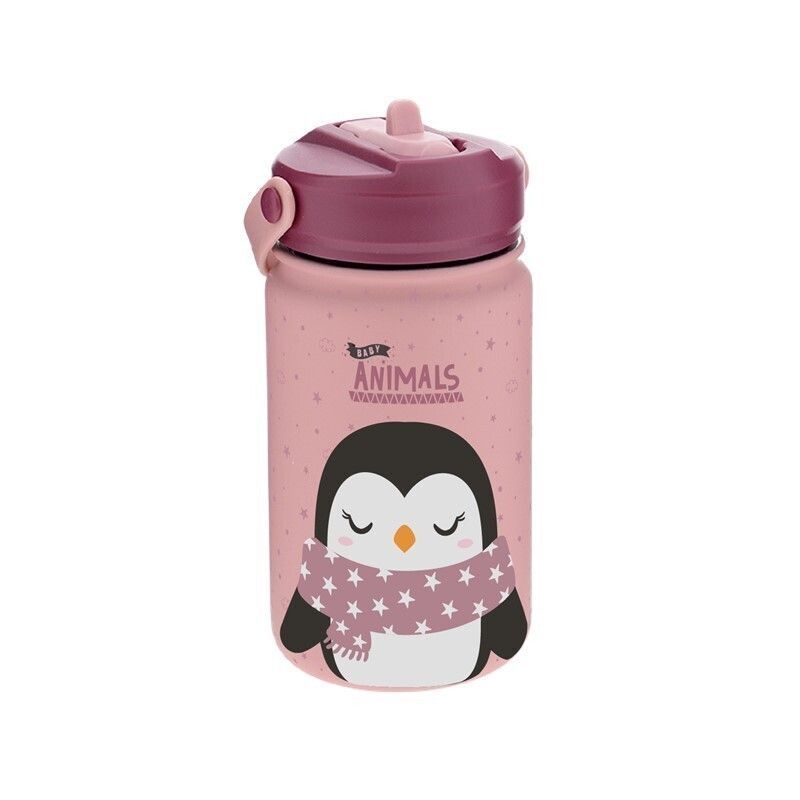 Botella de agua de 330 ml con diseño divertido de pingüino con bufanda estrellada, ideal para niños. Fabricada en plástico seguro, con tapa morada y pico para beber. Perfecta para el colegio, excursiones o actividades diarias. Diseño atractivo y funcional para mantener la hidratación de los más pequeños.