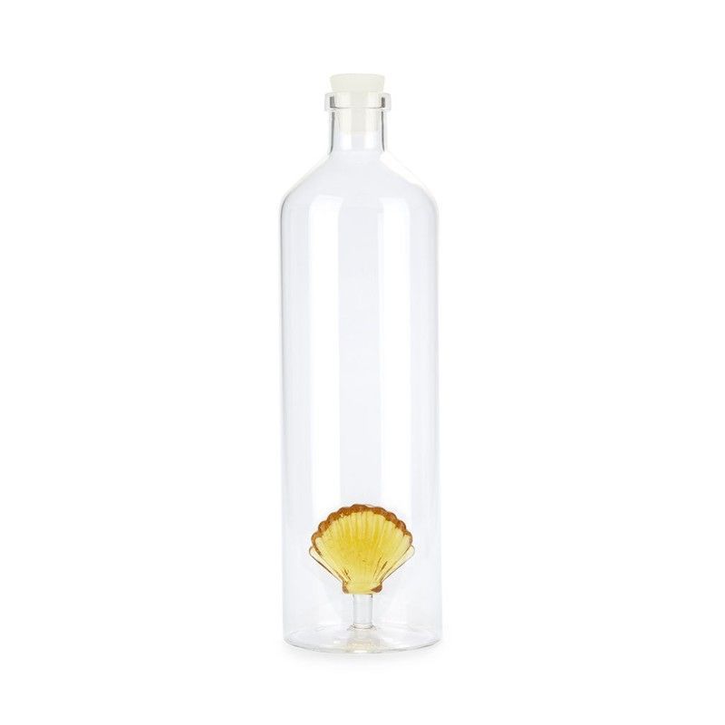 Botella de agua de 1.2 L con diseño de concha amarilla en la base, fabricada en vidrio transparente con tapón blanco. Ideal como objeto decorativo para la cocina o comedor, o como regalo original. Su diseño elegante y minimalista la convierte en un accesorio funcional y estético para cualquier hogar.