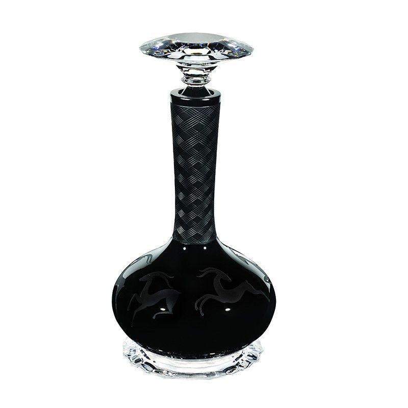 Botella de cristal y vidrio negro Gazelle, con diseño elegante y sofisticado. Ideal para servir bebidas en ocasiones especiales. Cuerpo con relieve de caballos, cuello texturizado y tapón facetado. Altura 32 cm, diámetro 16,6 cm. Calidad premium para decorar y servir con estilo.