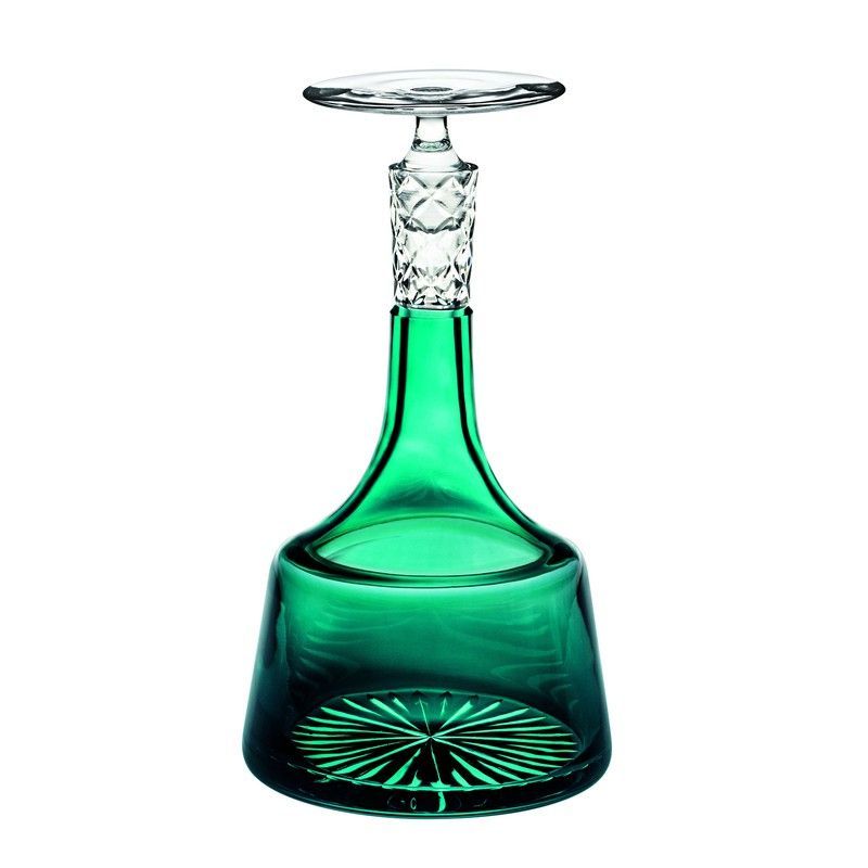 Elegante botella de vino de cristal Duality en tono verde intenso, con diseño sofisticado y detalles tallados en el cuello y base. Ideal para servir vinos de calidad en ocasiones especiales. Su forma campana y acabado pulido la convierten en un objeto decorativo y funcional para tu mesa. Hecha de cristal de alta calidad, resalta la elegancia de cua