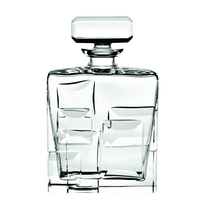Botella de whisky de cristal transparente con diseño geométrico y tapón cuadrado pulido. Ideal para servir y presentar licores con estilo. Fabricada en cristal de alta calidad, perfecta para ocasiones especiales o como regalo sofisticado. Dimensiones: 14,4 x 6,5 x 22,6 cm.