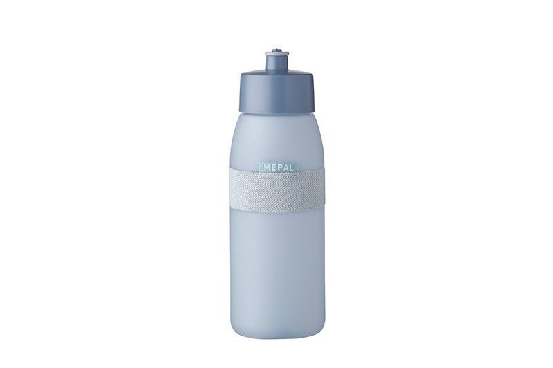 Botella deportiva Mepal Ellipse de 500 ml en color azul nórdico, ideal para mantener la hidratación durante el ejercicio o el día a día. Fabricada en plástico resistente con tapa segura y asa integrada para un agarre cómodo. Diseño ergonómico y mate con banda textil blanca con logo Mepal. Perfecta para deportistas, estudiantes y profesionales que b