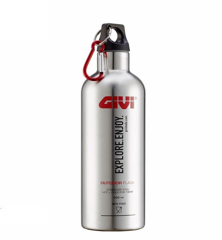 Botella térmica de acero inoxidable de 500 ml, ideal para aventuras al aire libre. Diseño resistente y elegante con tapa segura y mosquetón rojo para colgar. Perfecta para motociclistas y amantes de la naturaleza que buscan mantener sus bebidas a la temperatura ideal. Fabricada en acero inoxidable de alta calidad, libre de BPA. Ideal para uso diari