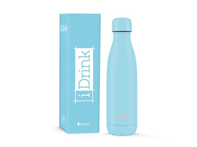 Botella térmica de 500 ml en color azul claro, fabricada en acero inoxidable para mantener tus bebidas calientes o frías durante horas. Diseño elegante y minimalista, ideal para llevar al trabajo, al gimnasio o en tus desplazamientos diarios. Incluye tapa hermética y empaque de cartón con el logo 'iDrink'.
