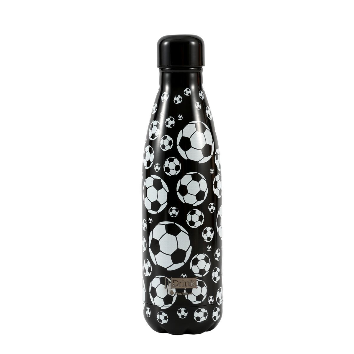 Botella térmica de 500 ml con diseño de balones de fútbol en blanco sobre fondo negro, ideal para deportistas y amantes del fútbol. Fabricada en acero inoxidable, mantiene bebidas calientes o frías durante horas. Perfecta para llevar al entrenamiento, al trabajo o al partido. Estilo moderno y funcional.