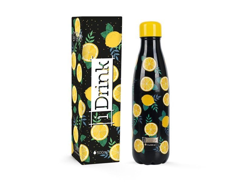 Botella térmica de 500 ml con diseño tropical de limones y hojas verdes sobre fondo negro. Fabricada en acero inoxidable, ideal para mantener tus bebidas frías o calientes durante horas. Con tapón amarillo y marca I-Drink, es perfecta para el día a día, el trabajo o el deporte. Estilo fresco y funcional para todos los amantes de lo natural.