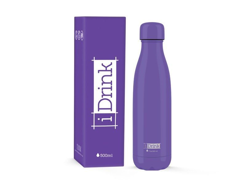 Botella térmica de 500 ml en color violeta, fabricada en acero inoxidable para mantener tus bebidas calientes o frías durante horas. Diseño elegante y minimalista con acabado mate, ideal para el día a día, el trabajo o el deporte. Incluye tapa hermética y logotipo 'iDrink' en la base. Perfecta para llevar contigo en cualquier momento.