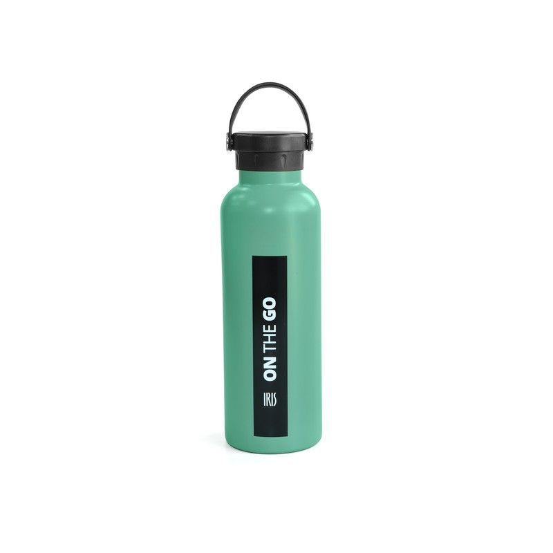 Botella termo de 750 ml en color verde, fabricada en acero inoxidable para mantener tus bebidas calientes o frías durante horas. Ideal para llevar en el día a día, con tapa negra y asa integrada para mayor comodidad. Diseño elegante y minimalista con etiqueta 'ON THE GO' y 'IRIS'. Perfecta para deportistas, viajeros y amantes del estilo de vida act