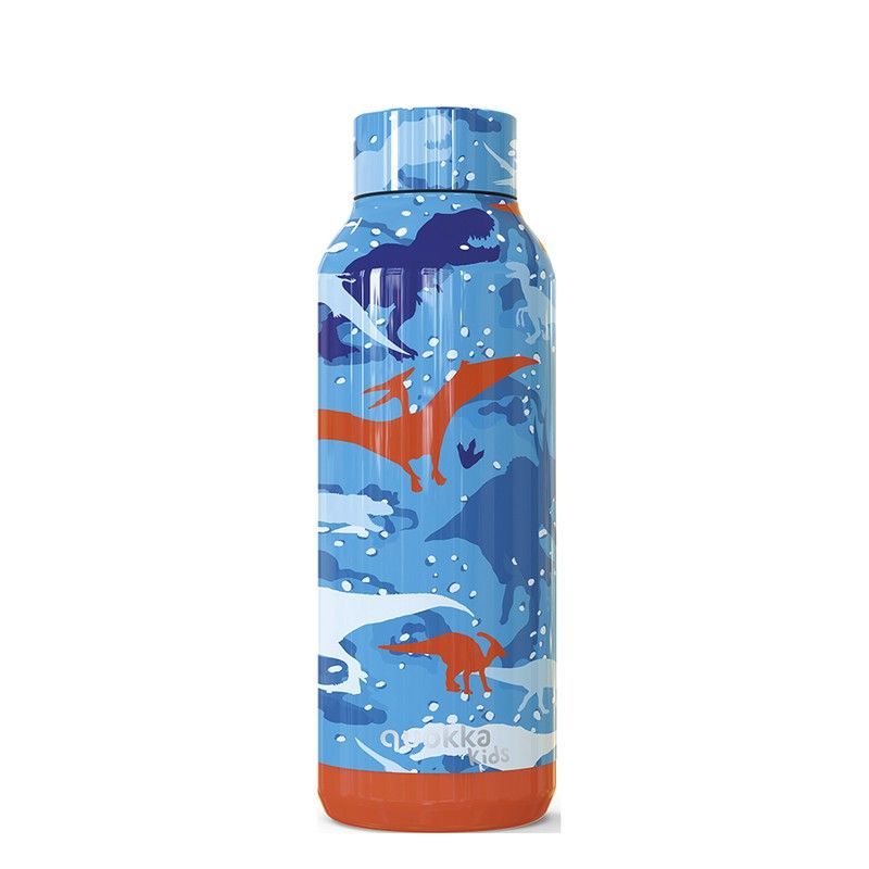 Botella termo para niños de 51 cl con diseño divertido de dinosaurios en tonos azules y naranjas. Fabricada en acero inoxidable, ideal para mantener las bebidas frías o calientes durante horas. Perfecta para el colegio, excursiones o el día a día. Resistente, ligera y con tapón seguro. Diseño atractivo que encantará a los pequeños amantes de los di